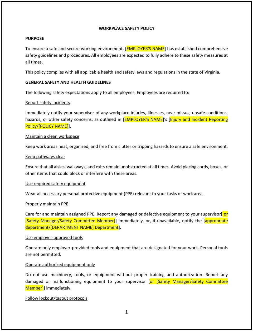 This workplace safety policy is designed to help Virginia businesses create and maintain a safe working environment for all employees. Whether you’re managing a small office or overseeing a larger team in construction or healthcare, this template ensures you cover all essential safety components required by Virginia state law.